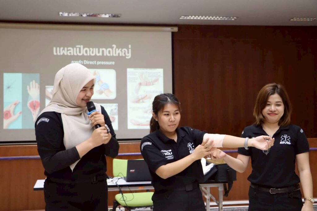 โดย ผศ.พิเชษฐ์ จันทวี อธิการบดี มรภ.สงขลา ได้มอบหมายให้ ผศ.ธนัย ตันวานิช รองอธิการบดีฝ่ายพัฒนานักศึกษา เป็นประธานเปิดการอบรม กล่าวรายงานโดย ว่าที่ร้อยตรีหญิง ปณัฐตา สายวิจิตร นักวิชาการสาธารณสุข วัตถุประสงค์เพื่อเพิ่มศักยภาพให้แกนนำสุขภาพ มรภ.สงขลา และส่งเสริมให้ผู้เข้าร่วมโครงการมีจิตอาสาช่วยเหลือกิจกรรมของมหาวิทยาลัย ผศ.ธนัย ตันวานิช กล่าวว่า การส่งเสริมสุขภาพในกลุ่มนักศึกษาถือเป็นสิ่งสำคัญอย่างยิ่ง เนื่องจากนักศึกษาเป็นกำลังสำคัญของประเทศในอนาคต การมีสุขภาวะที่ดีทั้งทางร่างกายและจิตใจ จะช่วยส่งเสริมให้สามารถดำเนินชีวิตและการศึกษาได้อย่างมีประสิทธิภาพ การพัฒนาแกนนำสุขภาพจึงเป็นกลไกสำคัญในการขับเคลื่อนกิจกรรมด้านสุขภาพภายในมหาวิทยาลัย และเป็นแบบอย่างที่ดีให้แก่เพื่อนนักศึกษา โครงการนี้นับเป็นโอกาสอันดีที่ผู้เข้าร่วมอบรมจะได้รับความรู้ ทักษะ และประสบการณ์ ทั้งในภาคทฤษฎีและภาคปฏิบัติ เพื่อนำไปประยุกต์ใช้ในการดูแลสุขภาพของตนเอง และสามารถถ่ายทอดสู่ผู้อื่นได้อย่างถูกต้องและเหมาะสม นอกจากนั้น ยังเป็นการปลูกฝังจิตอาสา และสร้างเครือข่ายแกนนำสุขภาพที่เข้มแข็งภายในมหาวิทยาลัย ผู้เข้าร่วมโครงการได้รับทั้งความรู้ ทักษะ และจิตอาสาในการดูแลสุขภาพและมีส่วนร่วมในกิจกรรมต่าง ๆ ของคณะและมหาวิทยาลัย โครงการที่จัดขึ้นจะเป็นประโยชน์ต่อผู้เข้าร่วมโครงการ และสามารถนำไปขยายผลต่อยอดสู่ครอบครัว ชุมชน และสังคมต่อไป ด้าน ว่าที่ร้อยตรีหญิง ปณัฐตา สายวิจิตร กล่าวว่า เนื่องด้วยในปัจจุบันนักศึกษามีแนวโน้มเผชิญกับปัญหาสุขภาพทั้งด้านร่างกายและจิตใจ อันเกิดจากพฤติกรรมการดำเนินชีวิตและสภาพแวดล้อมที่เปลี่ยนแปลงไป ประกอบกับการส่งเสริมสุขภาพในระดับมหาวิทยาลัย จำเป็นต้องอาศัยความร่วมมือจากนักศึกษาแกนนำในการเป็นแบบอย่างและถ่ายทอดความรู้สู่เพื่อนนักศึกษา งานบริการสุขภาพและอนามัย กองพัฒนานักศึกษา เล็งเห็นถึงความสำคัญของการพัฒนาแกนนำสุขภาพให้มีความรู้ ทักษะ และจิตอาสาในการดูแลสุขภาพและมีส่วนร่วมในกิจกรรมต่าง ๆ ของคณะและมหาวิทยาลัย จึงได้จัดโครงการในครั้งนี้ขึ้น ทั้งนี้ โครงการดังกล่าวมีนักศึกษา มรภ.สงขลา สนใจเข้าร่วมโครงการจำนวน 106 คน และได้รับเกียรติจากวิทยากรจากโรงพยาบาลสงขลา และงานบริการการแพทย์ฉุกเฉิน องค์การบริหารส่วนจังหวัดสงขลา งานสื่อสารองค์กร มรภ.สงขลา ร่วมถ่ายทอดความรู้และประสบการณ์ ในหัวข้อ ต่างๆ ดังนี้ 1. บทบาทหน้าที่ของแกนนำสุขภาพและแนวทางการสร้างมหาวิท