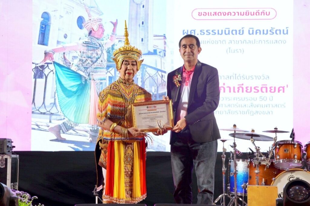 เมื่อวันที่ 30 สิงหาคม 2568 คณะมนุษยศาสตร์และสังคมศาสตร์ มหาวิทยาลัยราชภัฏสงขลา (มรภ.สงขลา) จัดงานคืนสู่เหย้า : HUSO Alumni Connect : 50 ปี แห่งการผลิตบัณฑิตคุณภาพ เพื่อรับใช้ท้องถิ่นและสังคม เฉลิมฉลองโอกาสครบรอบ 50 ปี ณ โรงแรมบีพี สมิหลา บีช สงขลา โดยมี ผศ.พิเชษฐ์ จันทวี รักษาราชการแทนอธิการบดี มรภ.สงขลา เป็นประธานในพิธีเปิดงานและมอบเกียรติบัตรเชิดชูเกียรติ แก่ ผศ.ธรรมนิตย์ นิคมรัตน์ ศิลปินแห่งชาติ สาขาศิลปะการแสดง (โนรา) ในโอกาสที่ได้รับรางวัล ‘ศิษย์เก่าเกียรติยศ’