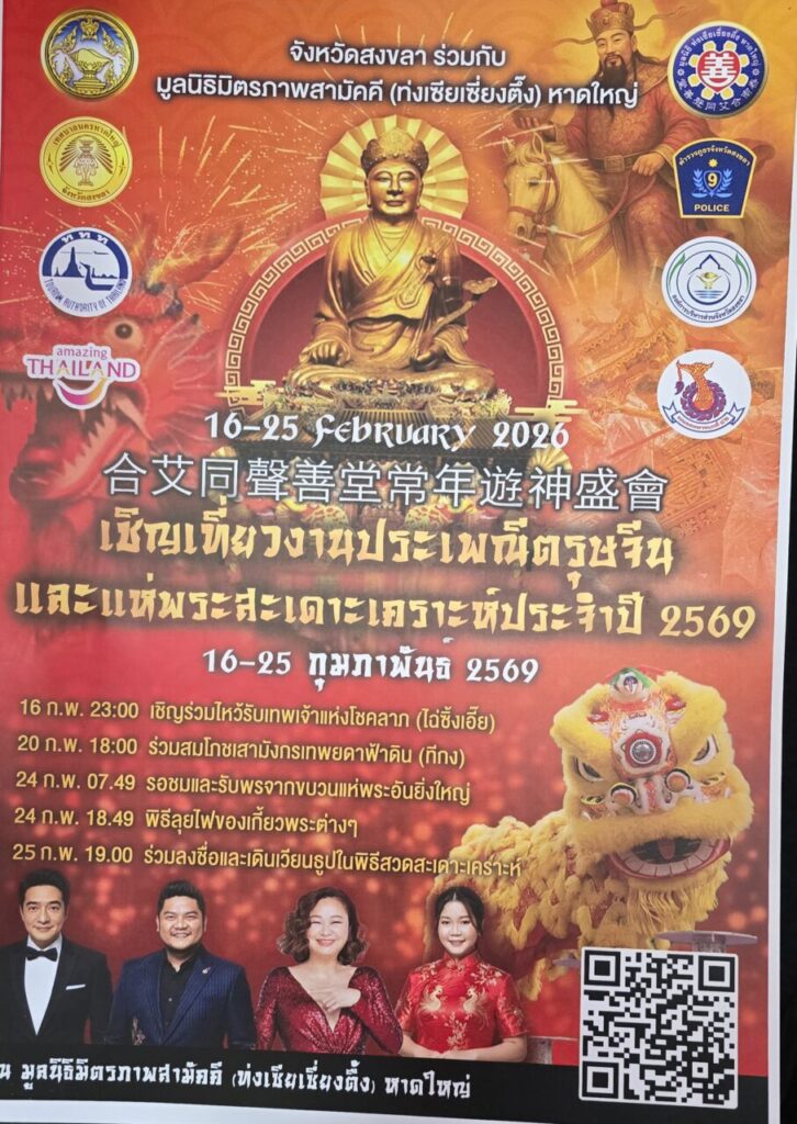 มูลนิธิมิตรภาพสามัคคี (ท่งเซียเซี่ยงตึ๊ง) หาดใหญ่ เชิญชวนประชาชน นักท่องเที่ยว และผู้สนใจ เข้าร่วมงานประเพณีแห่พระสะเดาะเคราะห์ ประจำปี 2569 ระหว่างวันที่ 16 – 25 กุมภาพันธ์ 2569 ณ บริเวณภายในมูลนิธิมิธิมิตรภาพลามัคดี (ท่งเชียงตั้ง)หาดใหญ่ ตลอดแนวถนนสวนหย่อมศุภสารรังสรรค์ เทศบาลนครหาดใหญ่