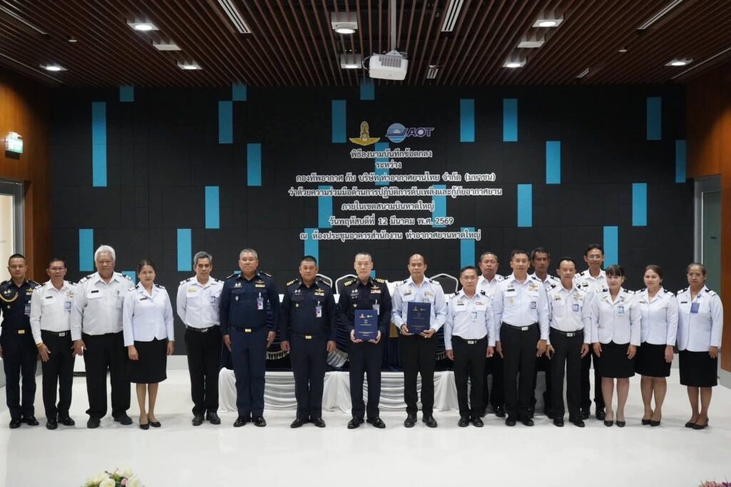 วันที่ 12 มีนาคม 2569 (เวลา 10.30 น.) ท่าอากาศยานหาดใหญ่ โดยนายกฤษฎา พุกะทรัพย์ ผู้อำนวยการท่าอากาศยานหาดใหญ่ (ผหญ.) และกองบิน 56 โดยนาวาอากาศเอก ณัฏปภัสร์ พุทธินนทนะวงษ์ ผู้บังคับการกองบิน 56 ร่วมลงนามบันทึกข้อตกลง ระหว่างกองทัพอากาศ กับ บริษัท ท่าอากาศยานไทย จำกัด (มหาชน) ว่าด้วยความร่วมมือด้านการปฏิบัติการดับเพลิงและกู้ภัยอากาศยาน ภายในเขตสนามบินหาดใหญ่ ฉบับปีพุทธศักราช 2569 เพื่อให้สอดคล้องตามข้อกำหนดของ กพท. ฉบับที่ 37 ว่าด้วยมาตรฐานสนามบิน และเพื่อเป็นการเพิ่มประสิทธิภาพในการปฏิบัติงานดับเพลิงและกู้ภัยอากาศยานภายในเขตสนามบินหาดใหญ่ ให้เป็นไปด้วยความปลอดภัยและรวดเร็วอย่างมีประสิทธิภาพตามมาตรฐานสากล รวมถึงส่งเสริม สนับสนุนการประสานงานระหว่างกองทัพอากาศ กับ ทอท. อันเป็นการบูรณาการขั้นตอนการดำเนินงานด้านดับเพลิงและกูภัยอากาศยานระหว่างสองหน่วยงาน และเพื่อให้มีแผนการประสานงานรองรับสถานการณ์กรณีอากาศยานเกิดเหตุฉุกเฉินหรือประสบอุบัติเหตุที่ชัดเจนขึ้น โดยมีผู้บริหารพนักงานท่าอากาศยานหาดใหญ่ ผู้แทนกองบิน 56 และผู้เกี่ยวข้องเข้าร่วมพิธีฯ ณ ห้องประชุม 1 อาคารสำนักงานท่าอากาศยานหาดใหญ่