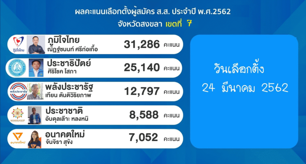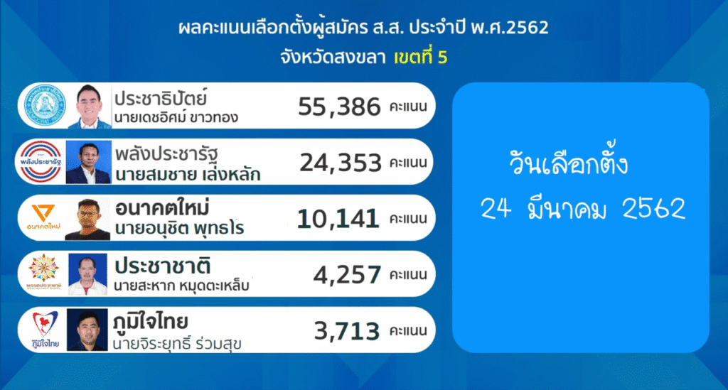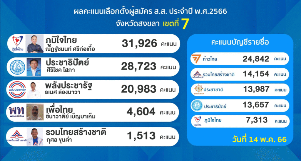ประชาธิปัตย์จะฟื้นอย่างไร? ในวันที่หมดยุคพรรคเลือกคน ประชาชนเลือกพรรค การเมืองภาคใต้กับพรรคประชาธิปัตย์ คือสิ่งที่แยกกันไม่ออกจนได้รับการตั้งฉายาว่า “ส่งเสาไฟฟ้าลงก็ชนะ” จึงไม่แปลกที่การเมืองจึงกลายเป็นมรดกตกทอด พ่อหยุดแล้วส่งลูกลงแทนก็ชนะ คนมาจากที่อื่นก็ชนะ ขอเพียงแค่ผู้สมัครคนนั้นสังกัดพรรคนายชวน ก็เพียงพอสำหรับชัยชนะแล้วอย่างเช่นนายศิริโชค โสภา เกิดกรุงเทพฯ แต่มาเป็นสส.เขต 7 สงขลา ตั้งแต่ปี 2544 แตกต่างจากนายวรวิทย์ หรือชื่อปัจจุบันคือนายเดชอิศม์ ขาวทอง แม้จะเกิดที่รัตภูมิในพื้นที่เขต 5 โดยตรง ในการเลือกตั้งเมื่อปี 2548 นายนิพนธ์ บุญญามณี ได้รับการขยับขึ้นสมัครสส.บัญชีรายชื่อ นายเดชอิศม์ พยายามเสนอตัวขอลงแทนแต่ไม่สำเร็จเลยอกหักไปลงพรรคไทยรักไทย ได้ 30,000 กว่าคะแนน แต่ไม่ชนะประพร เอกอุรุ คนเมืองสงขลาที่ลงในนามพรรคประชาธิปัตย์ ที่ผ่านมาพรรคประชาธิปัตย์ในภาคใต้เกือบทุกเขตในการส่งไม้ต่อจากพ่อสู่ลูกหลานหรือคนสนิทมาลงแทน ลงทุกครั้งก็ชนะทุกครั้ง บางคนในพื้นที่ไม่เคยเห็นหน้าในสภาไม่เคยได้ยินเสียง แต่เลือกตั้งทุกครั้งชนะทุกที ก่อนการเลือกตั้งปี 62 นายเดชอิศม์ เหมือนจะโชคดีจากการเสียชีวิตของสส.เก่าเขตนี้ และเขาได้รับการคัดเลือกเป็นผู้สมัครสส.คนใหม่ของค่ายสีฟ้า แต่ยุคนี้กระแสลุงตู่ พลเอกประยุทธ์ จันทร์โอชา มาแรงมากก่อนถึงวันเลือกตั้งปี 62 ไม่กี่วัน อภิสิทธิ์ ประกาศไม่เอาประยุทธ์ เหมือนฟ้าผ่ากลางหัวผู้สมัครสส.ภาคใต้หลายคน สส.สงขลาที่เคยครองมาตลอดทั้ง 8 เขต เหลือแค่ 3 หนึ่งในนั้นคือ สส.4 สมัยอย่างศิริโชค โสภา ต้องพ่ายแพ้ให้กับคนที่เคยเป็นผู้ช่วยตัวเองอย่างนายณัฏฐ์ชนน ศรีก่อเกื้อ จากค่ายภูมิใจไทย ที่เดินสายเจาะพื้นที่มาอย่างยาวนาน แตกต่างจากนายเดชอิศม์ ที่ลงสมัยแรกในยุคที่กระแสพรรคไม่ดีแต่คะแนนกลับมาเป็นที่ 1 ของจังหวัด คอการเมืองต่างบอกว่าหากเดชอิศม์ ลงพรรคลุงตู่คงชนะมากกว่านี้หลายเท่า หรือไม่ลงประชาธิปัตย์ก็ชนะได้ไม่ยากเช่นกัน เพราะคะแนนิยมพรรคนี้ตกลงมากการเลืออกตั้งในปี 2566 เที่ยวใช้บัตรเลือกตั้ง 2 ใบ ยิ่งตอกย้ำว่าชาวบ้านให้ความสำคัญกับการเลือกพรรคและคนแตกต่างกันอย่างชัดเจน ศิริโชค โสภา ที่ลงแก้มือในนามพรรคเดิมอีกครั้งก็ไม่สามารถเอาชนะแชมป์เก่าได้ จนเจ้าตัวต้องประกาศเลิกเล่นการเมืองเพราะสงสารแม่ยกที่ต้องเสียน้ำตาเวลาเขาแพ้ ต่อด้วยการลาออกจากพรรคประชาธิปัตย์ แต่ที่เขต 5 เดชอิศม์ ชนะอีกครั้งด้วยคะแนนทิ้งห่างคู่แข่งขาดลอยเหมือนเดิม คะแนนตัวบุคคลชนะขาดแต่คะแ