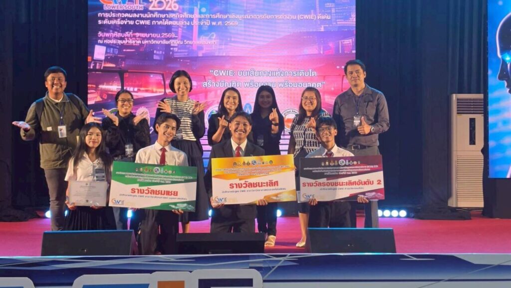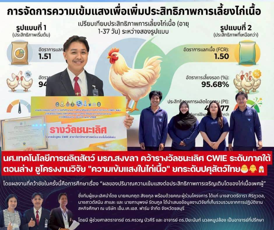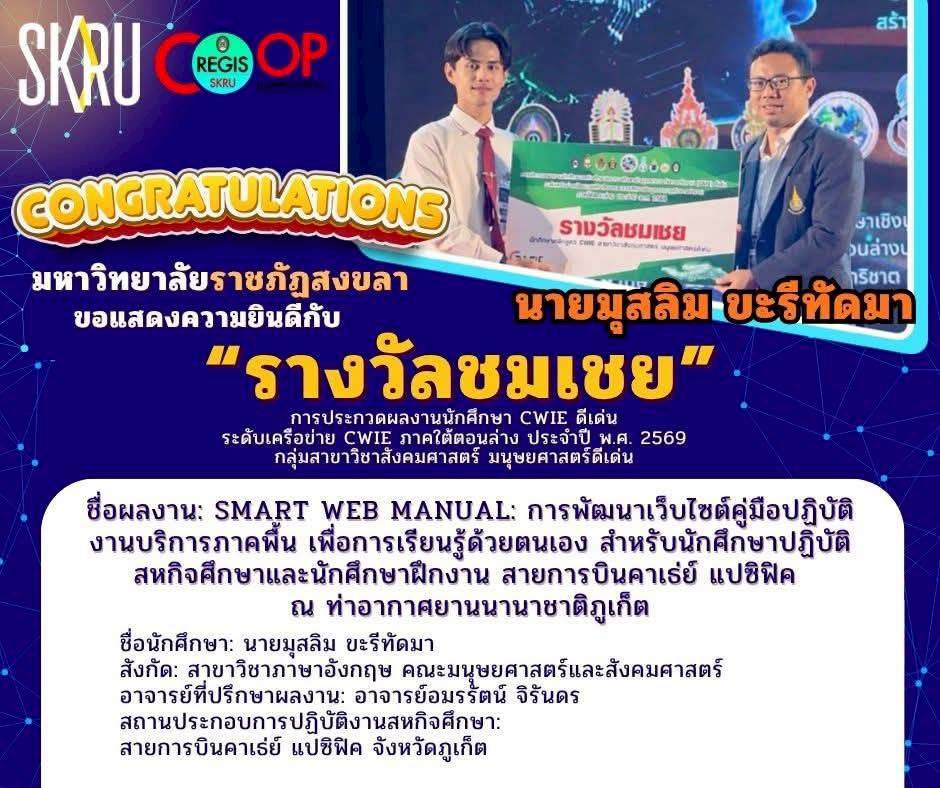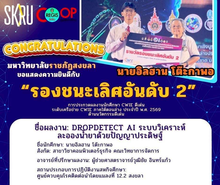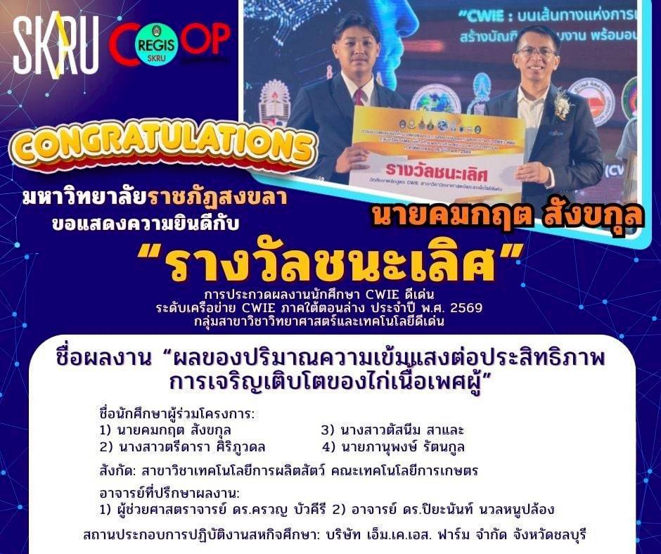 เมื่อวันที่ 9 เมษายน 2569 ศูนย์สหกิจศึกษา สำนักส่งเสริมวิชาการและงานทะเบียน มหาวิทยาลัยราชภัฏสงขลา (มรภ.สงขลา) นำโดย ผศ.ขนิษฐา พันชูกลาง รองผู้อำนวยการสำนักส่งเสริมวิชาการและงานทะเบียน พร้อมด้วยอาจารย์ที่ปรึกษาผลงานสหกิจศึกษา และเจ้าหน้าที่ประจำศูนย์สหกิจศึกษา นำนักศึกษาที่ได้รับรางวัลจากการประกวดผลงานสหกิจศึกษาระดับมหาวิทยาลัย กลุ่มสาขาวิชาวิทยาศาสตร์และเทคโนโลยีดีเด่น กลุ่มสาขาวิชาสังคมศาสตร์ มนุษยศาสตร์ดีเด่น และด้านนวัตกรรมดีเด่น เข้าร่วมประกวดผลงานนักศึกษาสหกิจศึกษาและการศึกษาเชิงบูรณาการกับการทำงาน (CWIE) ดีเด่น ระดับเครือข่ายพัฒนาสหกิจศึกษาและการศึกษาเชิงบูรณาการกับการทำงานภาคใต้ตอนล่าง ประจำปี พ.ศ. 2569 ณ หอประชุมปาริชาต มหาวิทยาลัยทักษิณ วิทยาเขตสงขลา ผลปรากฏว่าสามารถคว้ารางวัลจากการประกวดมาได้จำนวน 3 รางวัล ดังนี้ รางวัลชนะเลิศ กลุ่มสาขาวิชาวิทยาศาสตร์และเทคโนโลยีดีเด่น ชื่อผลงาน : ผลของปริมาณความเข้มแสงต่อประสิทธิภาพการเจริญเติบโตของไก่เนื้อเพศผู้ นำเสนอโดย นายคมกฤต สังขกุล และผู้ร่วมโครงการ 1. นางสาวตรีดารา ศิริภูวดล 2. นางสาวตัสนีม สาและ 3. นายภานุพงษ์ รัตนกูลสาขาวิชาเทคโนโลยีการผลิตสัตว์ คณะเทคโนโลยีการเกษตร อาจารย์ที่ปรึกษาผลงาน ผศ.ดร.ครวญ บัวคีรี และ อาจารย์ ดร.ปิยะนันท์ นวลหนูปล้อง สถานประกอบการปฏิบัติงานสหกิจศึกษา บริษัท เอ็ม.เค.เอส. ฟาร์ม จำกัด จังหวัดชลบุรี ทั้งนี้ นักศึกษาที่ได้รับรางวัลชนะเลิศในระดับเครือข่าย CWIE ภาคใต้ตอนล่าง จะเข้าร่วมประกวดผลงานสหกิจศึกษในระดับชาติต่อไป รางวัลรองชนะเลิศ อันดับ 2 ด้านนวัตกรรมดีเด่น ชื่อผลงาน : DropDetect Al ระบบวิเคราะห์ละอองน้ำยาด้วยปัญญาประดิษฐ์ นำเสนอโดย นายอิลฮาน โต๊ะกาพอ สาขาวิชาคอมพิวเตอร์ธุรกิจ คณะวิทยาการจัดการ อาจารย์ที่ปรึกษาผลงาน ผศ.วุฒิชัย อินทร์แก้ว สถานประกอบการปฏิบัติงานสหกิจศึกษา ศูนย์ควบคุมโรคติดต่อนําโดยแมลงที่ 12.2 สงขลา รางวัลชมเชย กลุ่มสาขาวิชาสังคมศาสตร์ มนุษยศาสตร์ดีเด่น ชื่อผลงาน : Smart Web Manual: การพัฒนาเว็บไซต์คู่มือปฏิบัติงานบริการภาคพื้น เพื่อการเรียนรู้ด้วยตนเอง สำหรับนักศึกษาปฏิบัติสหกิจศึกษาและนักศึกษาฝึกงาน สายการบินคาเธ่ย์ แปซิฟิค ณ ท่าอากาศยานนานาชาติภูเก็ต นำเสนอโดย นายมุสลิม ขะรีทัดมา สาขาวิชาภาษาอังกฤษ คณะมนุษยศาสตร์และสังคมศาสตร์ อาจารย์ที่ปรึกษาผลงาน อาจารย์อมรรัตน์ จิรันดร สถานประกอบการปฏิบัติงานสหกิจศึกษา สายการบินคาเธ่ย์ แปซิฟิค จังหวัดภูเก็ตข้อมูล/รูป โดย ศูนย์สหกิจศึกษา มหาวิทยาลัยราชภัฏสง