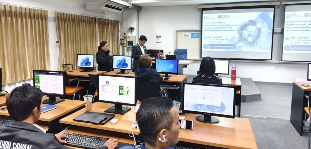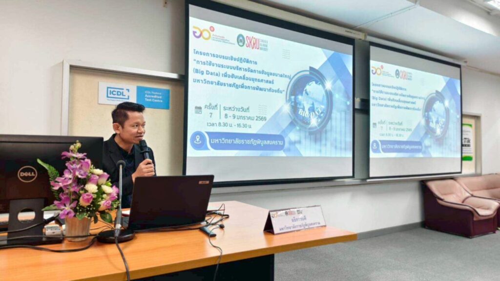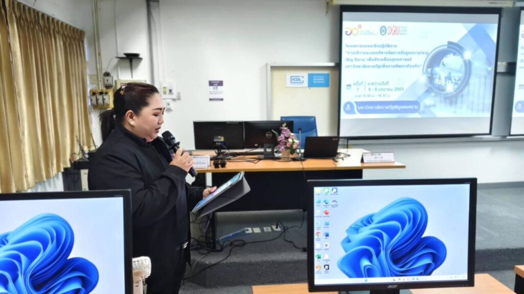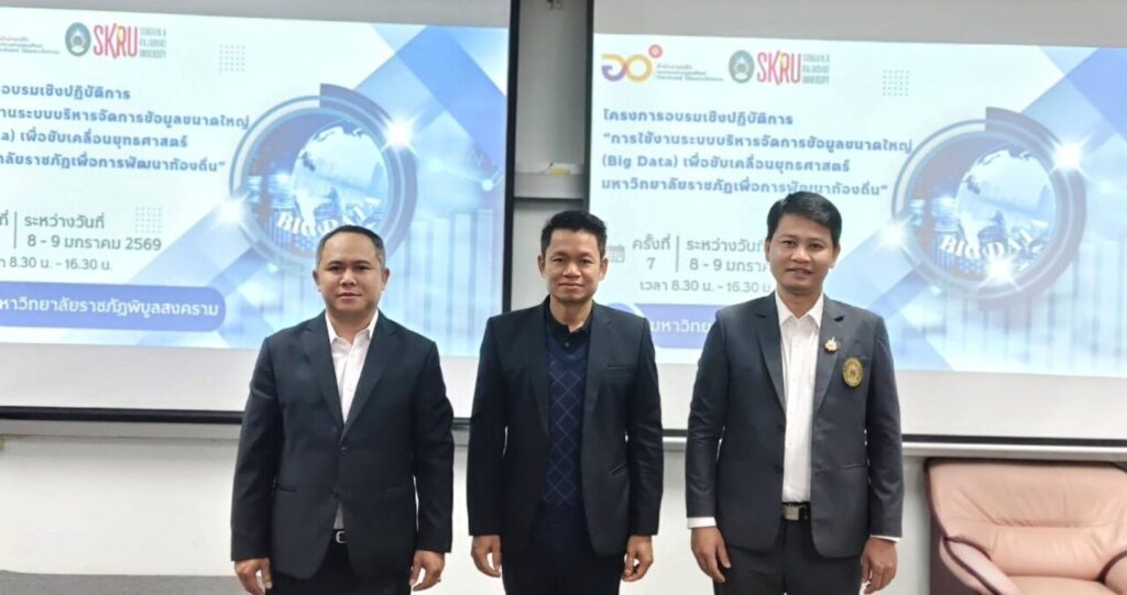 วันที่ 8-9 มกราคม 2569 ผศ.พิเชษฐ์ จันทวี อธิการบดีมหาวิทยาลัยราชภัฏสงขลา (มรภ.สงขลา) มอบหมายให้ ทีมบุคลากรงานนโยบายและยุทธศาสตร์ กองนโยบายและแผน สำนักงานอธิการบดี มรภ.สงขลา ประกอบด้วย นางสโรชา บริสุทธิ์ นักวิเคราะห์นโยบายและแผนชำนาญการ นางกฤชณัท พงศ์จันทรเสถียร และ นางวิภาวี โสตถิพันธุ์ เจ้าหน้าที่บริหารงานทั่วไป จัดโครงการอบรมเชิงปฏิบัติการการใช้งานระบบบริหารจัดการข้อมูลขนาดใหญ่ (Big Data) เพื่อขับเคลื่อนยุทธศาสตร์มหาวิทยาลัยราชภัฏเพื่อการพัฒนาท้องถิ่น ครั้งที่ 7 ณ ห้อง COMPUTER LAB 106 ชั้น 1 สถาบันเทคโนโลยีดิจิทัล มหาวิทยาลัยราชภัฏพิบูลสงคราม (ส่วนทะเลแก้ว) จังหวัดพิษณุโลก ในการนี้ ผศ.ดร.ชุมพล เสมาขันธ์ อธิการบดี มรภ.พิบูลสงคราม ได้มอบหมายให้ รศ.ดร.โชติ บดีรัฐ รองอธิการบดีฝ่ายแผนและยุทธศาสตร์ เป็นประธานในพิธีเปิด