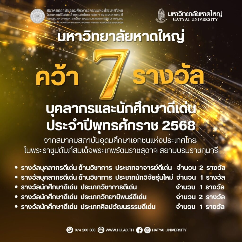 มหาวิทยาลัยหาดใหญ่ คว้า 7 รางวัล “บุคลากรและนักศึกษาดีเด่น” ประจำปี 2568