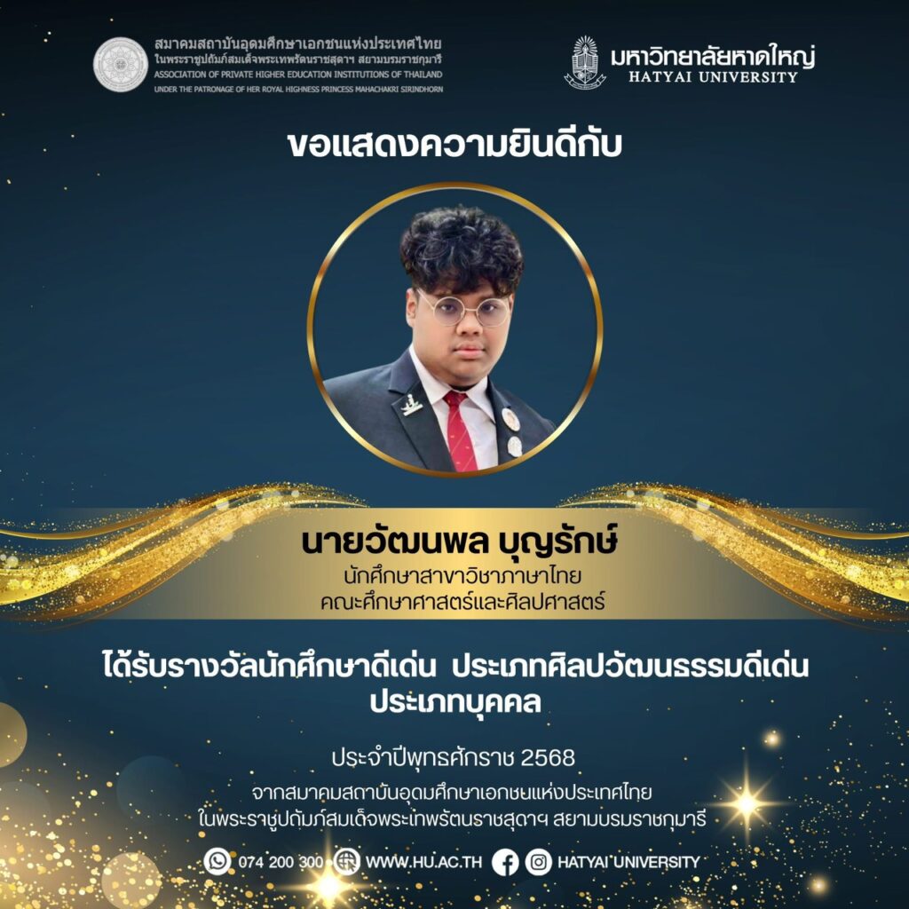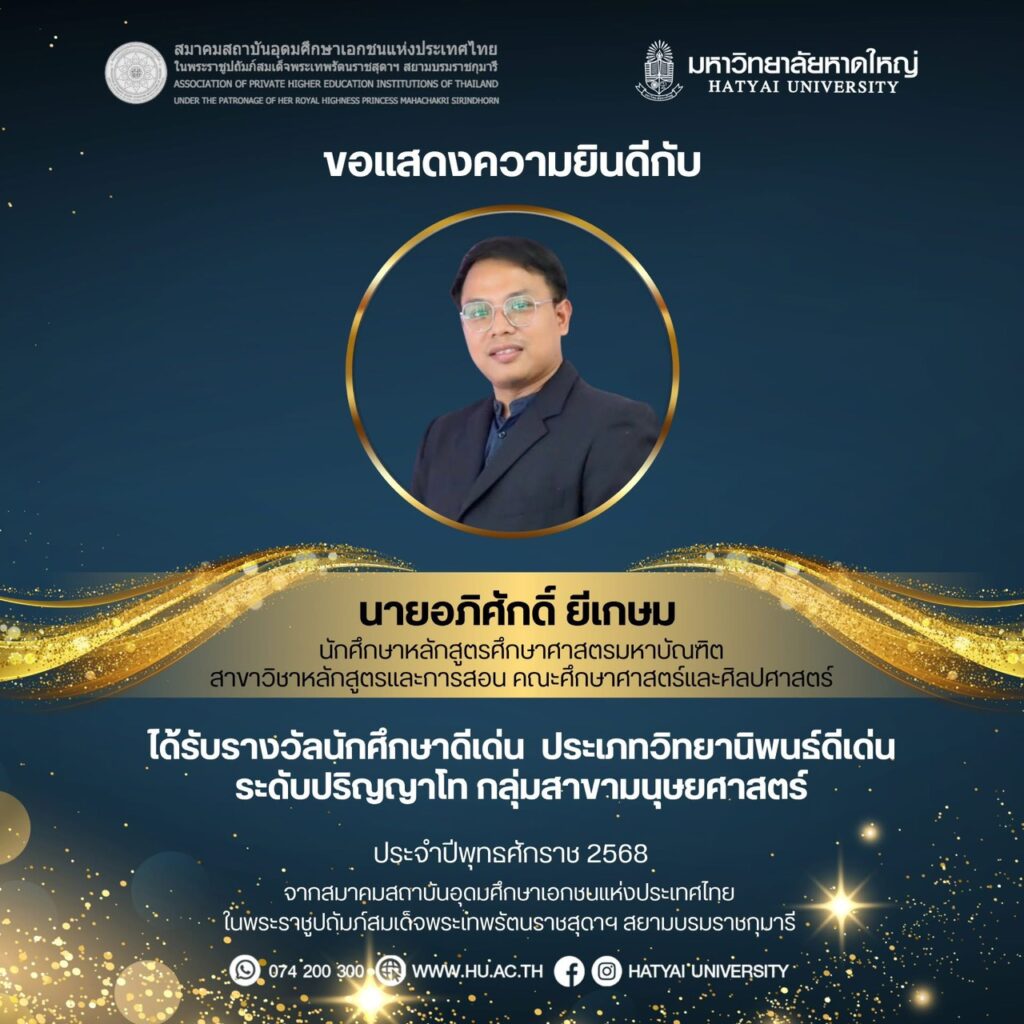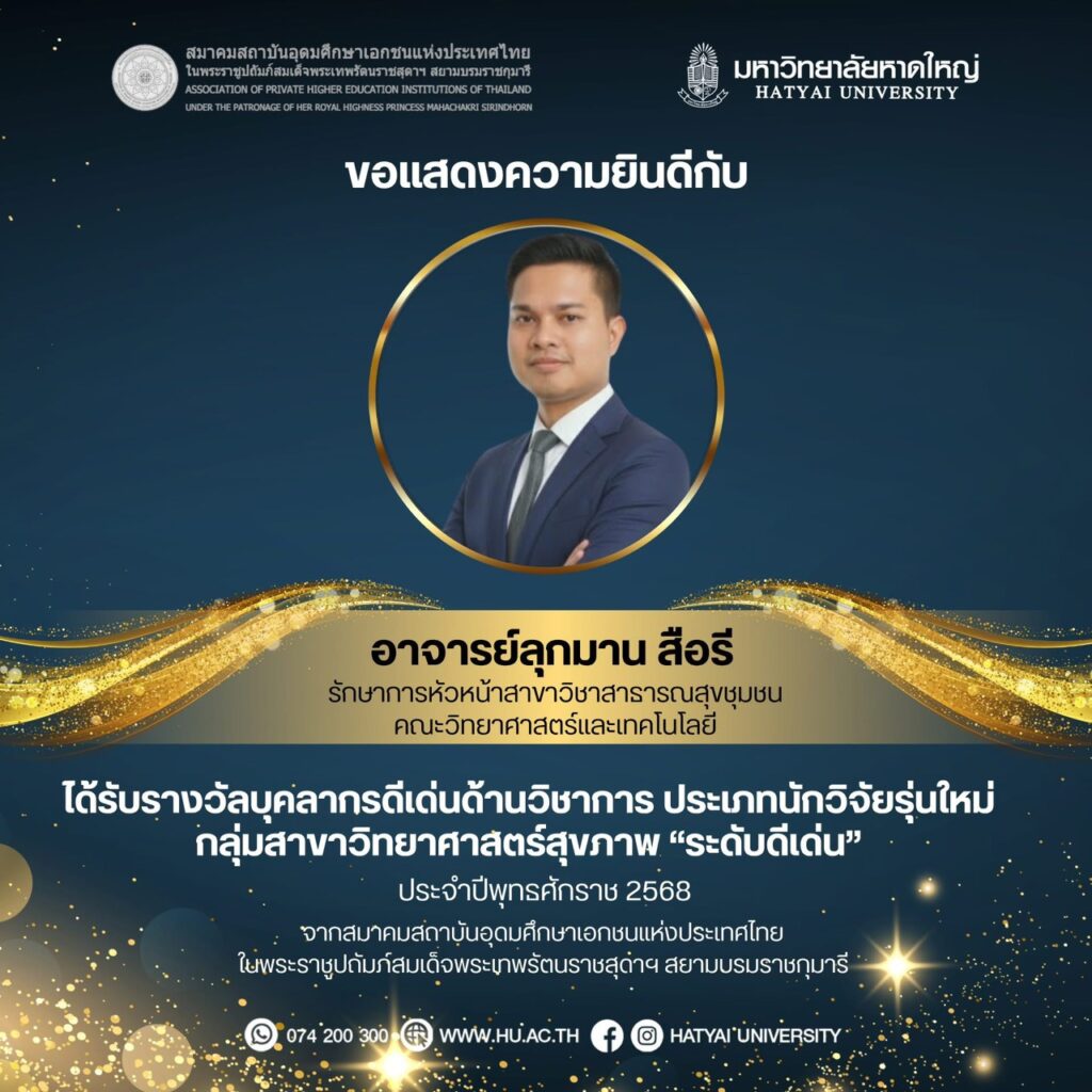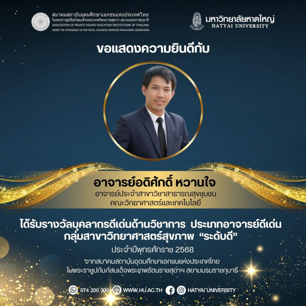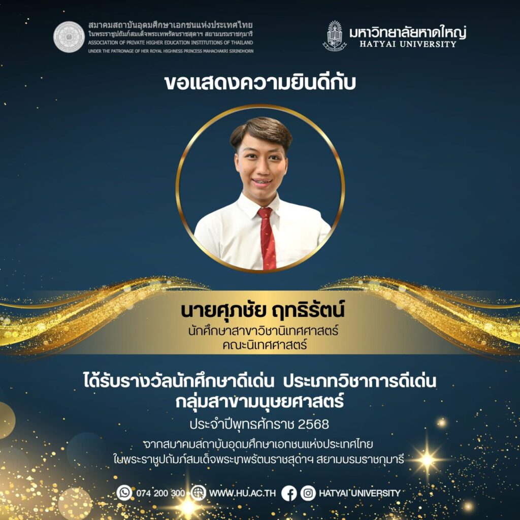 มหาวิทยาลัยหาดใหญ่ ขอแสดงความยินดีอย่างยิ่ง กับคณาจารย์และนักศึกษาทุกท่านที่ได้รับรางวัลอันทรงเกียรตินี้ ซึ่งถือเป็นความภาคภูมิใจร่วมกันของชาวม.หาดใหญ่ และเป็นแรงบันดาลใจในการมุ่งมั่นพัฒนาศักยภาพสู่ความเป็นเลิศทางวิชาการอย่างต่อเนื่อง
