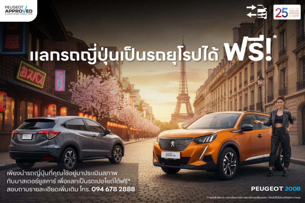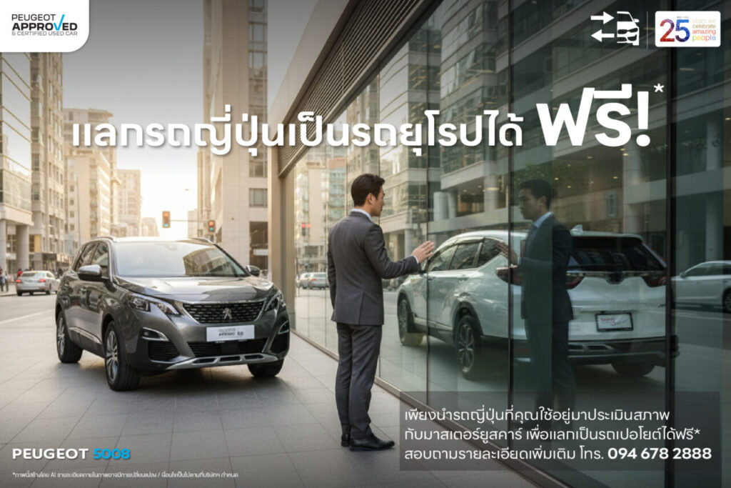 ‘รถญี่ปุ่น’ แลก ‘รถยุโรป’ ฟรี! มาสเตอร์ เซอร์ทิฟายด์ ยูสคาร์ เขย่าวงการรถมือสอง ยกระดับสู่ประสบการณ์พรีเมียมสไตล์ฝรั่งเศส แบบไม่เคยมีมาก่อน วันนี้ ถึงสิ้นเดือนพฤศจิกายน 2568มาสเตอร์ เซอร์ทิฟายด์ ยูสคาร์ ศูนย์รวมรถยนต์มือสองครบวงจร ภายใต้บริษัท มิลเลนเนียม กรุ๊ป คอร์ปอเรชั่น (เอเชีย) จำกัด (มหาชน) ขอเชิญชวนเจ้าของรถยนต์ญี่ปุ่น ที่กำลังมองหาความเปลี่ยนแปลงครั้งสำคัญ สู่การเป็นเจ้าของรถยนต์ยุโรปมือสองระดับพรีเมียม PEUGEOT APPROVED & CERTIFIED USED CAR กับเอสยูวียอดนิยม รุ่น 2008, 3008, หรือ 5008 โดยนำรถคันปัจจุบันมาประเมินราคาสูงสุด* เพื่อรับมูลค่าพิเศษในการแลกเปลี่ยนเป็นรถ PEUGEOT APPROVED & CERTIFIED USED CAR ได้อย่างคุ้มค่า
