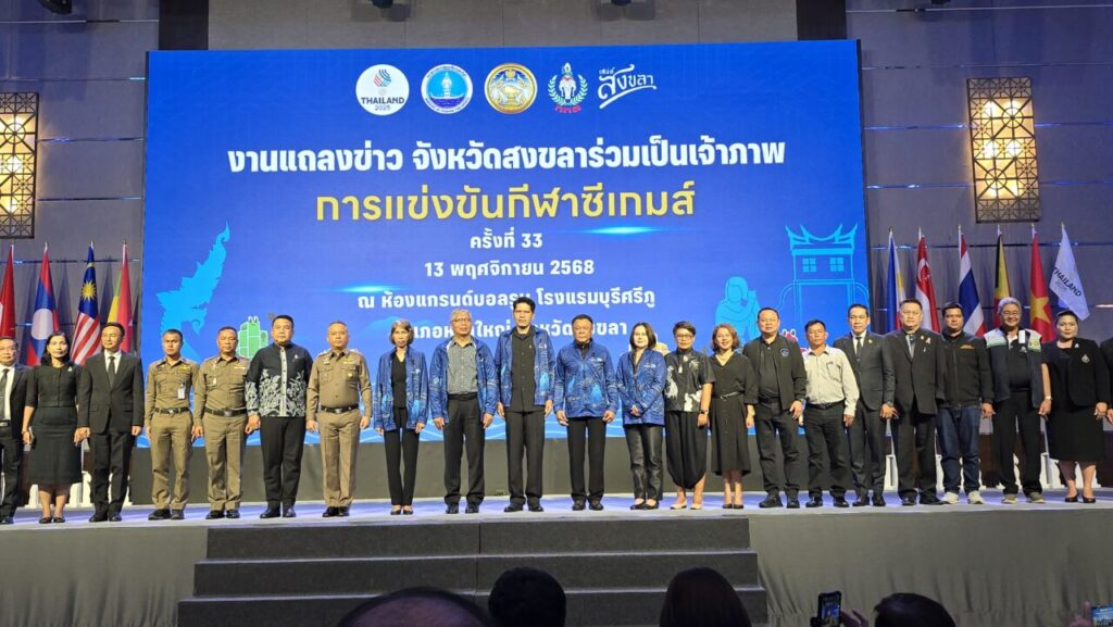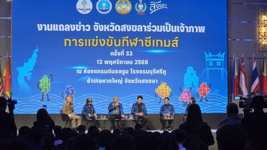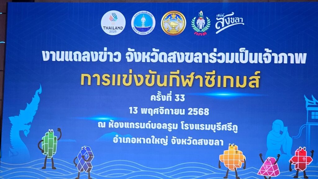 วันนี้ (13 พฤศจิกายน 2568) ณ ห้องแกรนด์บอลรูม ชั้น 2 โรงแรมบุรีศรีภู อำเภอหาดใหญ่ จังหวัดสงขลา มีการแถลงข่าวการจัดการแข่งขันกีฬาซีเกมส์ ครั้งที่ 33 พ.ศ. 2568 (ค.ศ. 2025) ซึ่งประเทศไทยเป็นเจ้าภาพจัดการแข่งขัน โดยมีจังหวัดสงขลาเป็นเจ้าภาพร่วม ระหว่างวันที่ 9–20 ธันวาคม 2568