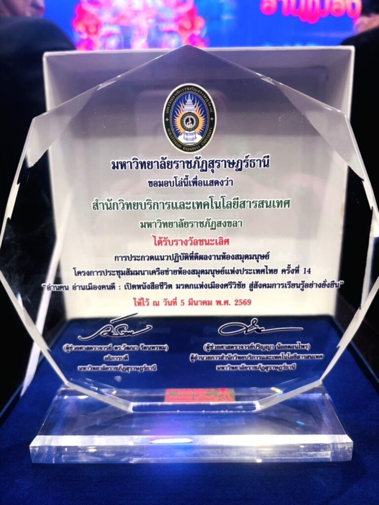 เมื่อวันที่ 5-6 มีนาคม 2569 สำนักวิทยบริการและเทคโนโลยีสารสนเทศ มหาวิทยาลัยราชภัฏสงขลา (มรภ.สงขลา) นำโดย ผศ.ปิยกุล จันทบูรณ์ รองผู้อำนวยการสำนักวิทยบริการและเทคโนโลยีสารสนเทศ นางสาวฉวีวรรณ แก้วฤดี หัวหน้างานวิทยบริการ เป็นตัวแทนเข้าร่วมโครงการประชุมสัมมนาเครือข่ายห้องสมุดมนุษย์แห่งประเทศไทย ครั้งที่ 14 (The Thiland Human Library Network Seminar) ณ ห้องประชุมออดิทอเรียม (AUditorium Room) อาคารทีปังกรรัศมีโชติ มหาวิทยาลัยราชภัฏสุราษฎร์ธานี และชุมชนในบาง คลองร้อยสายแห่งลุ่มน้ำตาปี อำเภอเมือง จังหวัดสุราษฎร์ธานี ภายใต้แนวคิด “อ่านคน อ่านเมืองคนดี : เปิดหนังสือชีวิต มรดกแห่งเมืองศรีวิชัย สู่สังคมการเรียนรู้อย่างยั่งยืน” โดยได้รับเกียรติจาก ผศ.ดร.ณัฐวุฒิ สุวรรณทิพย์ รองอธิการบดีฝ่ายวิชาการและทรัพยากรบุคคล มหาวิทยาลัยราชภัฏสุราษฎร์ธานี กล่าวเปิดโครงการสัมมนา โอกาสเดียวกันนี้ สำนักวิทยบริการและเทคโนโลยีสารสนเทศ มรภ.สงขลา ได้ส่งผลงานแนวปฏิบัติที่ดี “การทำขนมต้มสามเหลี่ยมข้าวเหนียวดำผัดกะทิด้วยใบกะพ้อ สู่การพลิกฟื้นภูมิปัญญาอาหารท้องถิ่นภาคใต้ รูปแบบ On-demand” เข้าร่วมประกวดในงานดังกล่าว โดยมี ผศ.ปิยกุล จันทบูรณ์ รองผู้อำนวยการฯร่วมเสวนานำเสนอผลงาน พร้อมทั้งถ่ายทอดแนวคิดและความเป็นมา ซึ่งเป็นการบูรณาการองค์ความรู้ภูมิปัญญาท้องถิ่นด้านอาหารภาคใต้ ถ่ายทอดผ่านกระบวนการห้องสมุดมนุษย์ในรูปแบบที่เข้าถึงง่ายและสามารถเรียนรู้ได้ตามความต้องการ สะท้อนบทบาทของสถาบันการศึกษาในการอนุรักษ์และต่อยอดมรดกทางวัฒนธรรมสู่สังคมแห่งการเรียนรู้อย่างยั่งยืน