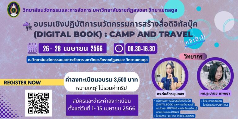 วิทยาลัยนวัตกรรมและการจัดการ มหาวิทยาลัยราชภัฏสงขลา (มรภ.สงขลา) วิทยาเขตสตูล ขอเชิญผู้สนใจเข้าร่วมโครงการอบรมเชิงปฏิบัติการนวัตกรรม“การสร้างสื่อดิจิทัลบุ๊ค (Digital Book) : Camp and T