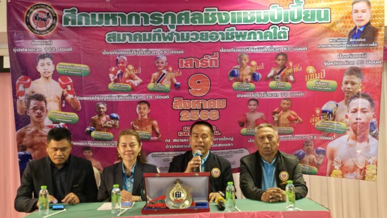 วันที่ 19 กค.2568 สมาคมกีฬามวยอาชีพภาคใต้ จัดแถลงข่าว " ศึกมหาการกุศลชิงแชมป์เปี้ยน สมาคมกีฬามวยอาชีพภาคใต้" โดยมีผู้ร่วมแถลงข่าว นายพิทยา รัตนพันธ์ ซึ่งเป็นผู้อำนวยการศูนย์เทคโนโลยีสารสนเทศและการสื่อสาร ศูนย์อำนวยการบริหารจังหวัดชายแดนภาคใต้ (ศอ.บต.) นายกสมาคมกีฬามวยอาชีพภาคใต้ จังหวัดสงขลา,นางอุไรวรรณ จันลาภ ผู้อำนวยการสำนักงานการกีฬาแห่งประเทศไทย จังหวัดสงขลา,นายประพันธ์ ศรีสวัสดิ์ เลขาประธานกา