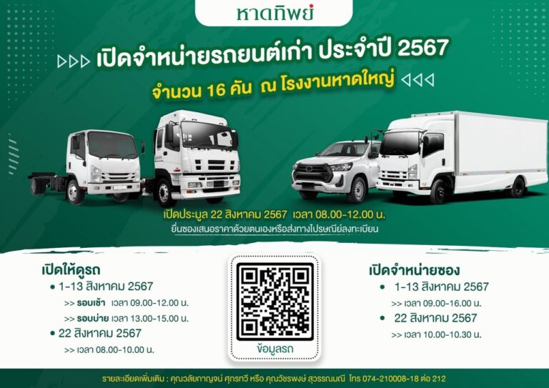 บริษัท หาดทิพย์ จำกัด (มหาชน) เปิดจำหน่ายรถยนต์เก่า ประจำปี 2567 (แบบเหมา) จำนวน 16 คัน ประกอบด้วย รถยนต์บรรทุกส่วนบุคคล (กระบะบรรทุก), รถบรรทุกส่วนบุคคล (บรรทุกเฉพาะกิจ), รถจักรยานยนต์, รถบรรทุก ไม่ประจำทาง (ลากจูง), รถบรรทุกไม่ประจำทาง (รถกึ่งพ่วง ตู้บรรทุก) และรถบรรทุกส่วนบุคคล (รถพ่วง ตู้บรรทุก ตู้แห้ง) ณ โรงงานหาดใหญ่ ต.บ้านพรุ อ.หาดใหญ่ จ.สงขลา โดยมีรายละเอียดการเปิดประมูล ดังนี้